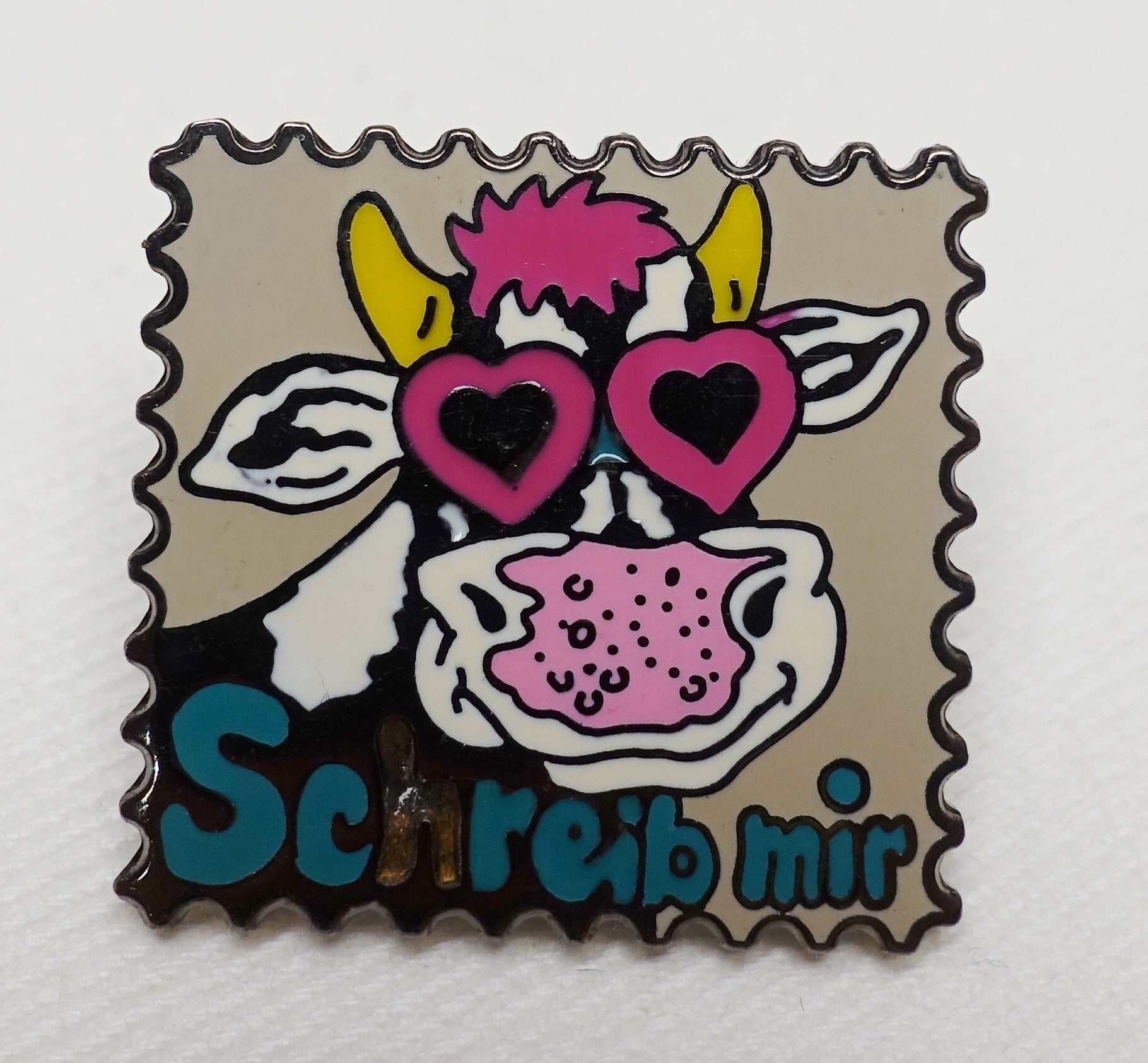 Diese lustigen Kuh Pins im Briefmarkenformat dürfen weiterziehen. Es sind insgesamt 2 Pins mit unterschiedlichen Motiven drauf. Das Angebot giltet für das ganze Set.