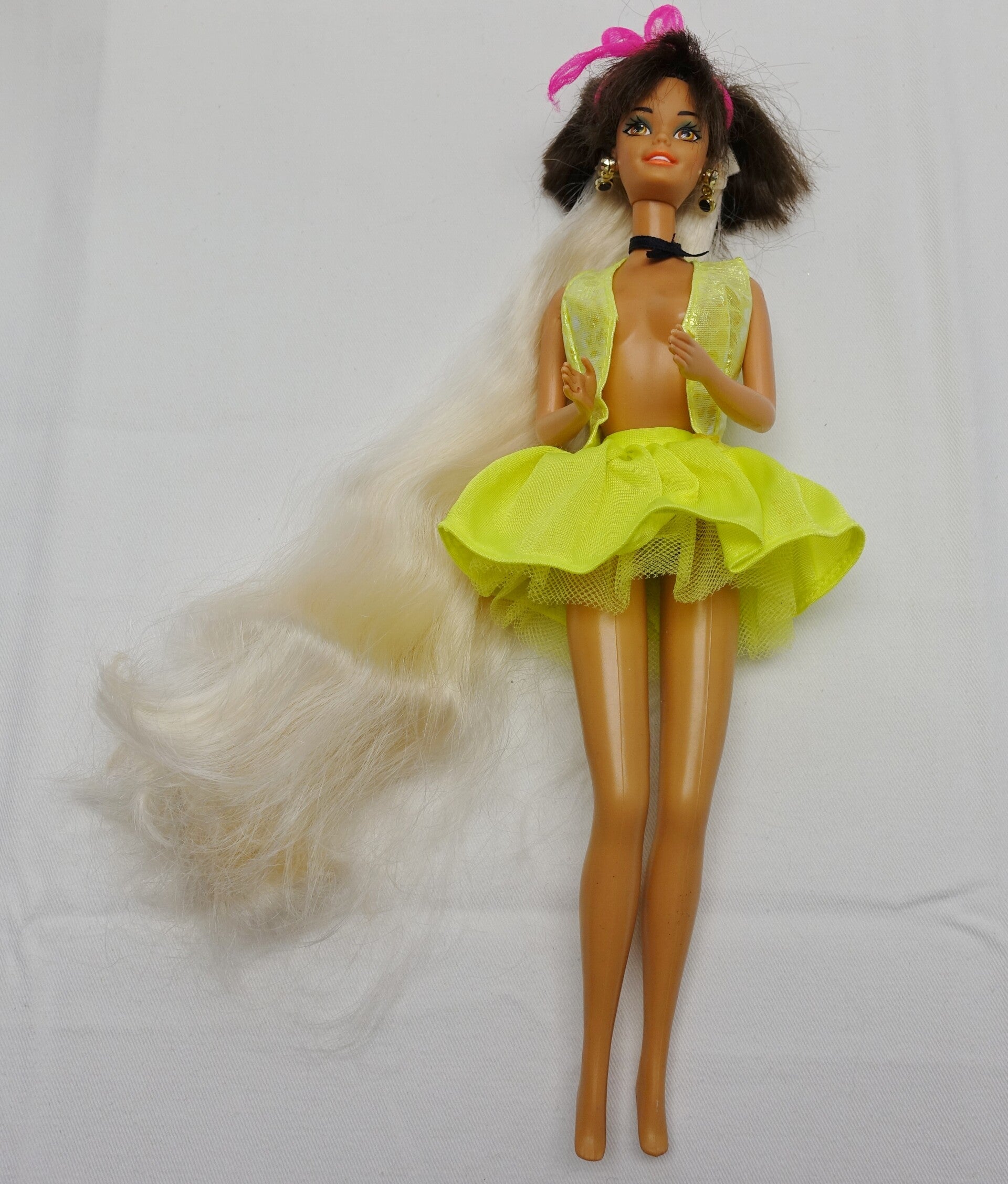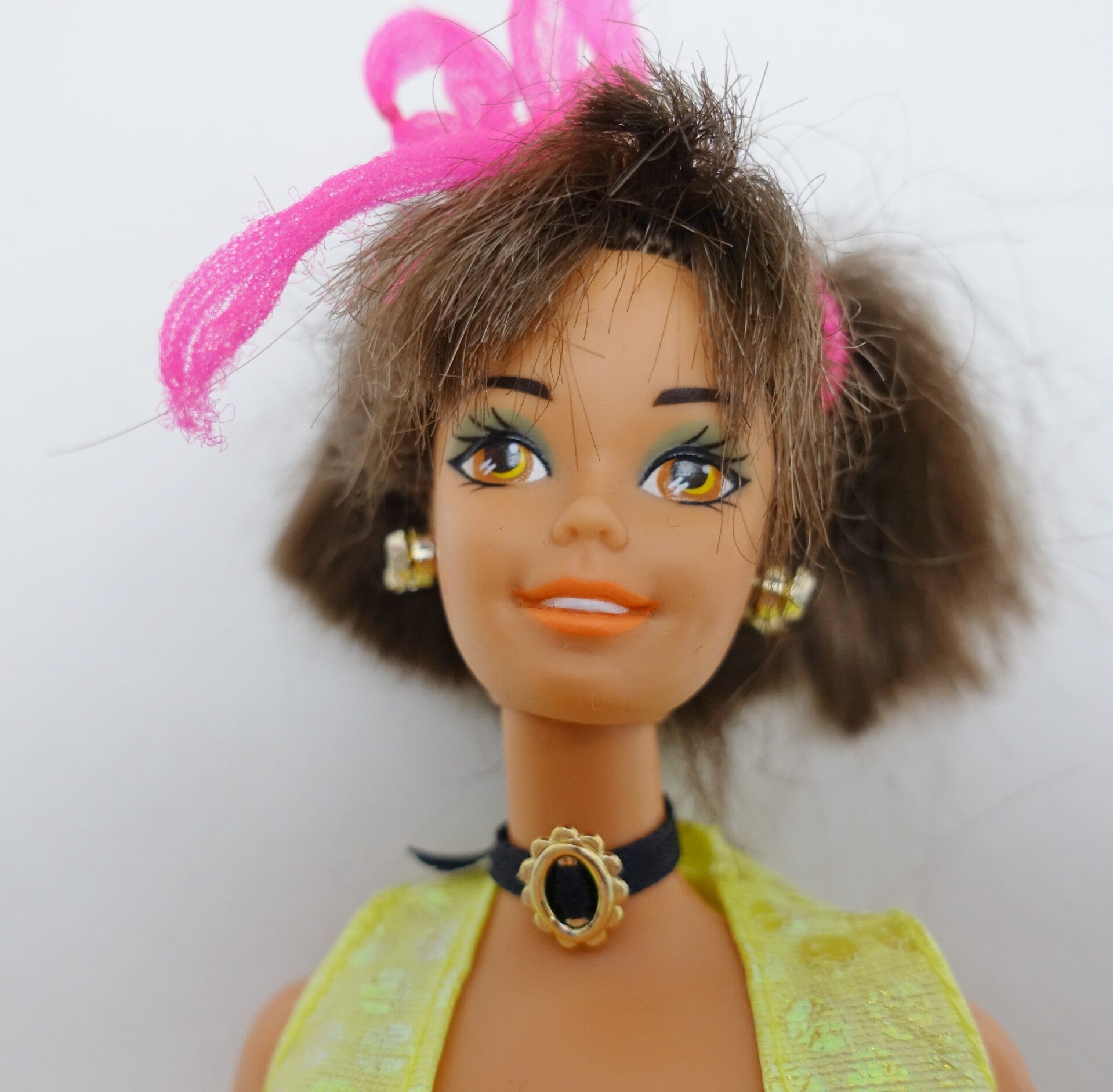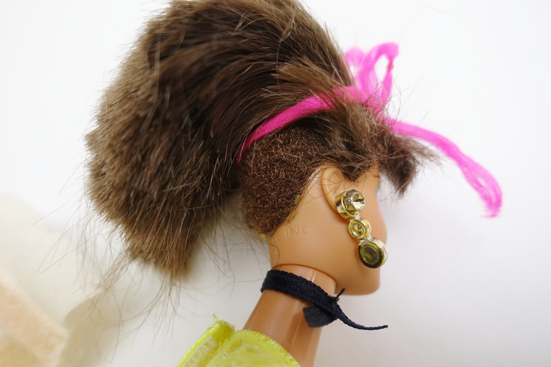 Diese hübsche Cut n Style Brunette Barbie darf weiterziehen. Ihre Haare sind zu einer Kurzhaarfrisur geschnitten worden. Doch mit ihrer Haarschleife sieht sie auch so toll aus. Dazu trägt sie Teile ihres originalen Outfits. Sie kommt auch noch mit einem extra Haarteil, dass man mit Klettverschluss festmachen und stylen kann.