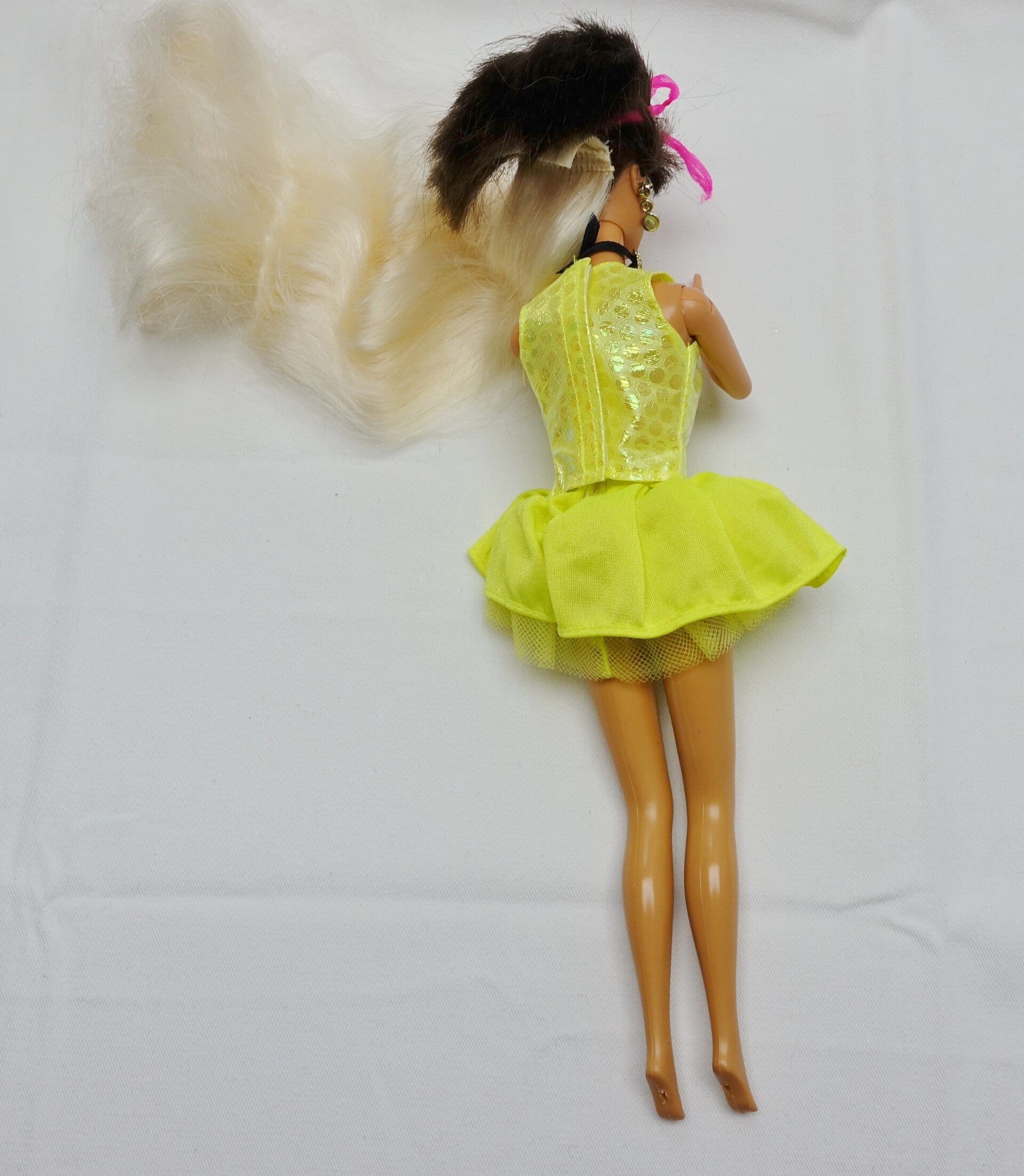 Zustand gesamt: Die Barbie selbst ist in einem guten Zustand. Die Haare sind einer Kurzhaarfrisur gewichen. Dafür kommt sie mit einem extra Haarteil. Die Naht der gelben Veste vorne ist leider aufgegangen, sodass die Veste nun offen steht.