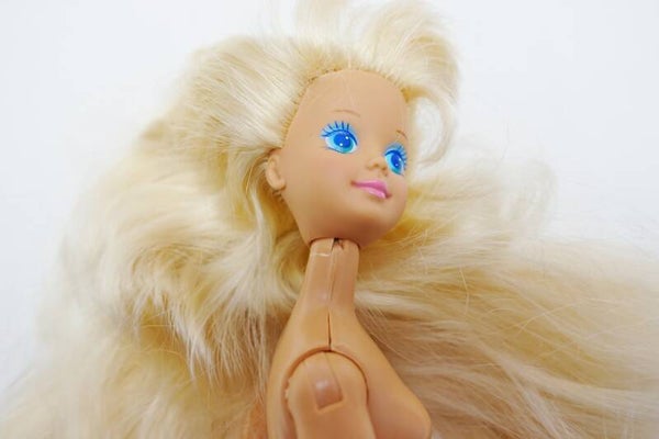 Zustand gesamt: Die Barbie selbst ist in einem gebrauchten Zustand. Leider ist ein Stück am Nacken abgebrochen und ein weiteres Stück hat einen Riss. Gegebenfalls könnte man das rissige Stück festkleben. Der Kopf hält momentan gut in der Form.