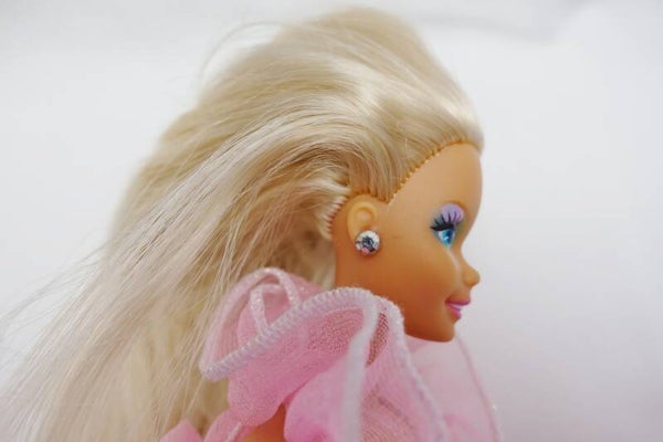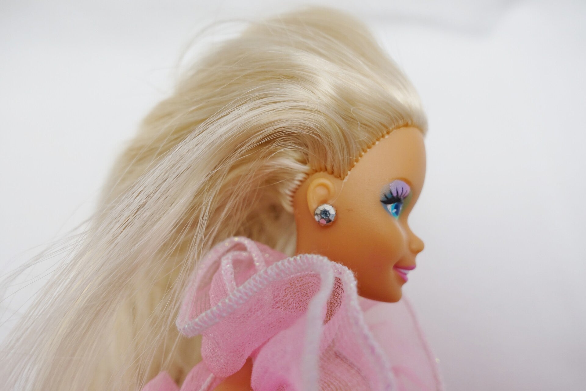 Zustand gesamt: Die Barbie sowie das Outfit ist in einem guten Zustand. Bei den Beinen von Barbie hat es schwarze Punkte/Flecken die in das plastik eingezogen sind. Aber ansonsten eine wunderhübsche Barbie. Die Haare sind nicht geschnitten, sie kam so mit 2 verschiedenen Haarlängen. Durch das waschen sind ihre Haare glatt und weich geworden und lassen sich toll stylen