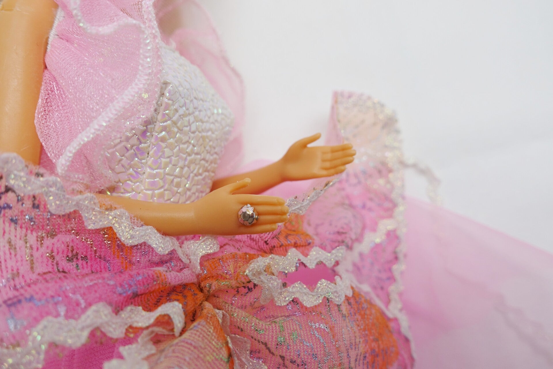 Diese bezaubernde Costume Ball Barbie aus den 90ern darf weiterziehen. Sie hat noch ihren Schmuck und trägt ihr originales Outfit bestehend aus einem pinken Rock und einem weissen Oberteil sowie einer pinken Stola und einer Maske die man, mittels Klettverschluss, auf ihren Rock festmachen kann. Die Maske selbst kann man auch selbst tagen, eben für einen tollen Maskenball.