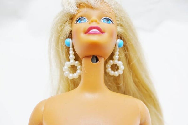 Zustand gesamt: Die Barbie ist in einem guten Zustand. Einzig ein Stück vom Nacken ist abgebrochen und ein Teilstück ist etwas spröde. Wenn Barbie den Kopf senkt, sieht man das fehlende Nackenstück fast nicht mehr.