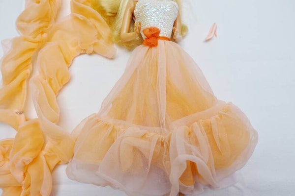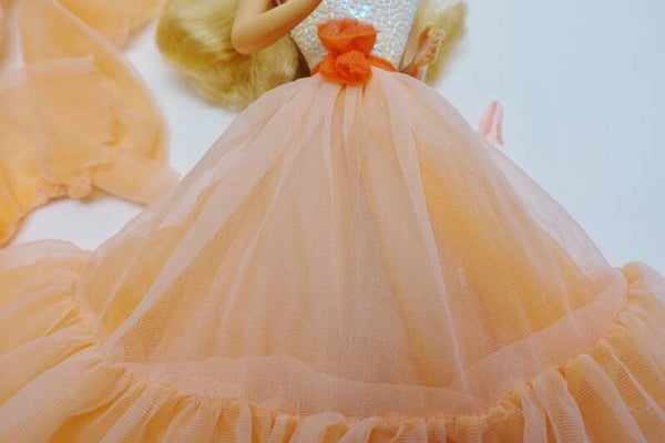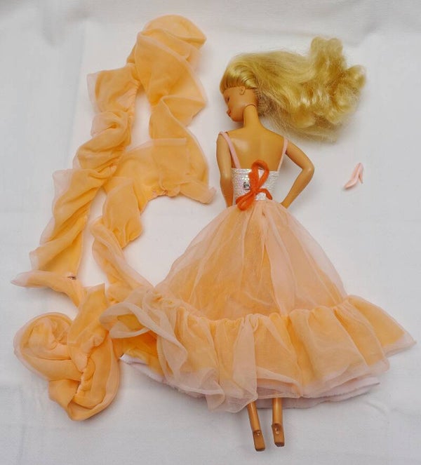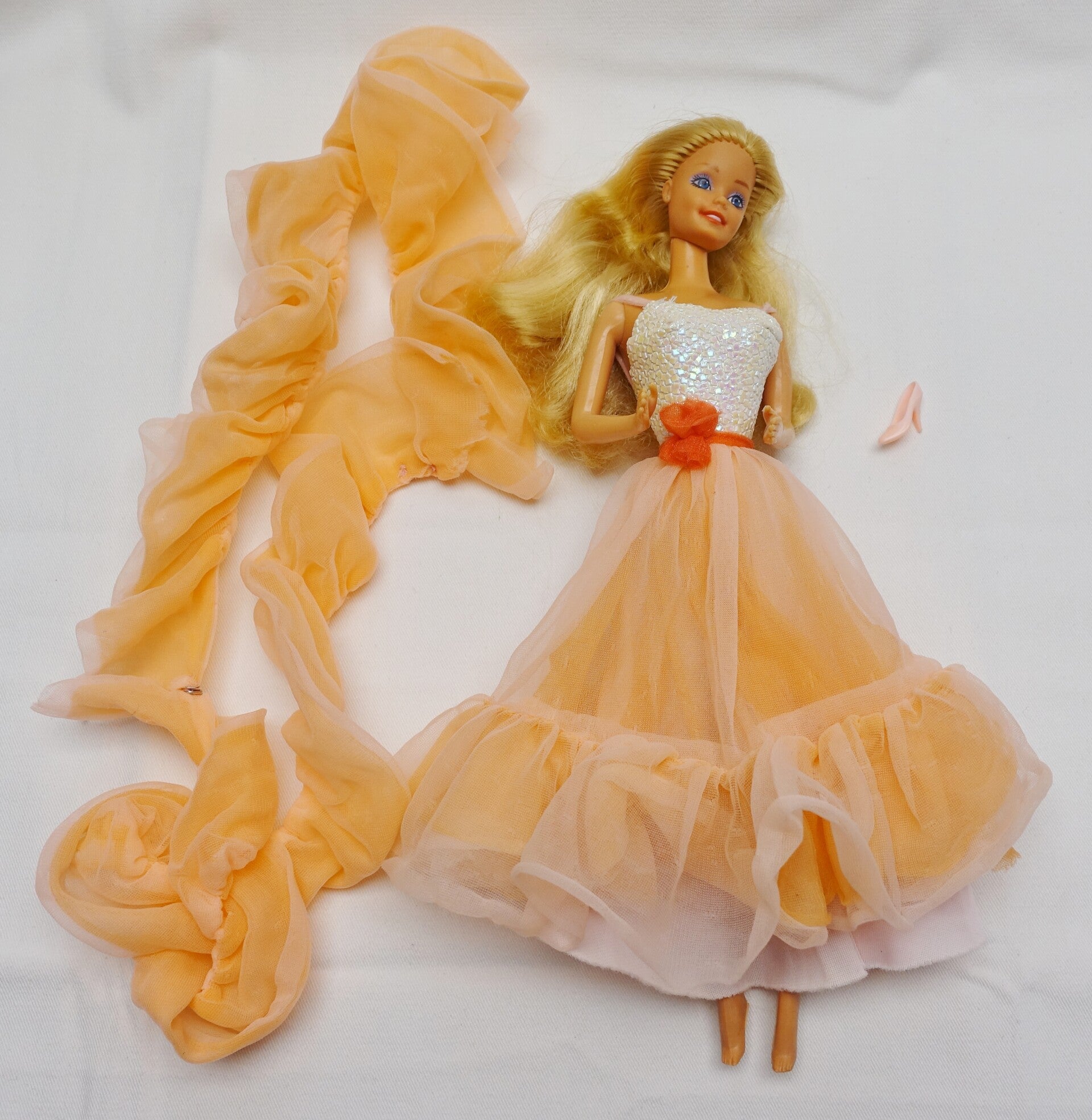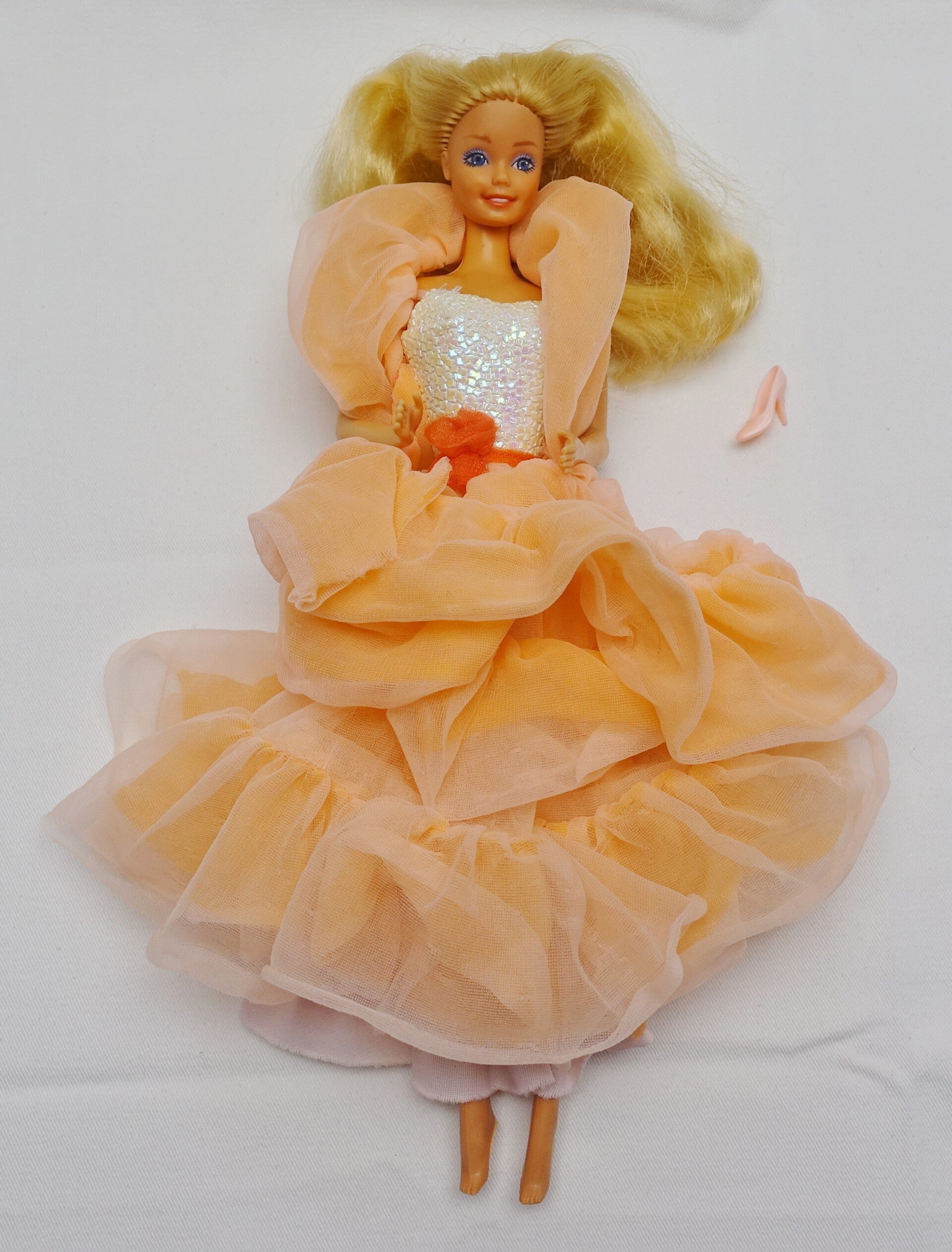 Diese ikonische Barbie der 80er Jahre darf weiterziehen. Barbie trägt ihr originales Outfit bestehend aus einem Rock mit Oberteil, einer Blume zum festmachen, und einer langen Stola. Dazu gibt es noch einen einzelnen Schuh für den ganz speziellen Cinderella Moment. (die Wahrheit, Leider ist der zweite Schuh unauffindbar)