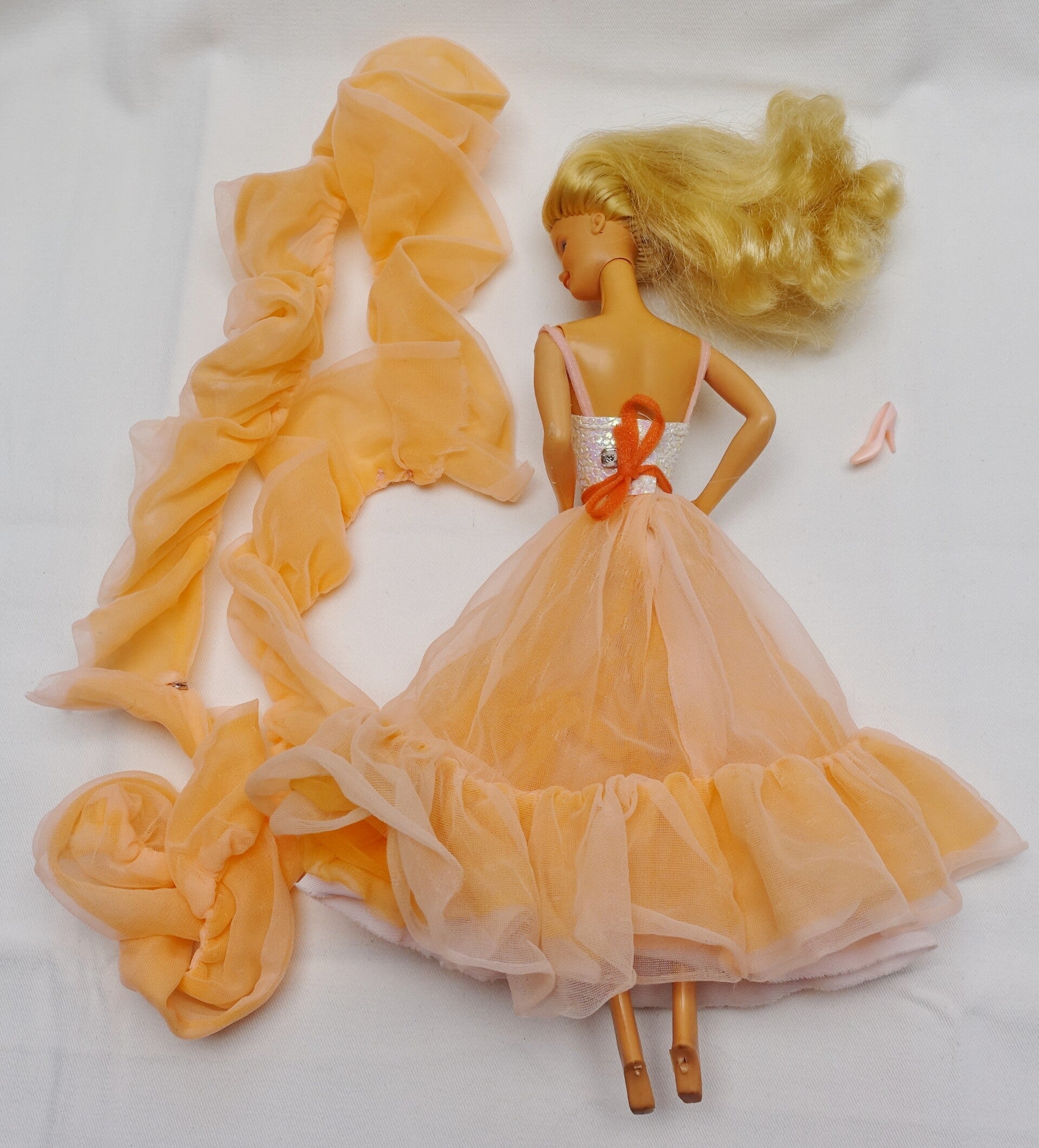 Zustand gesamt: Die Barbie ist in einem guten Zustand. Ihr Kopf ist lose und steht nicht mehr so stabil in Position, der Nacken ist noch intakt. Eine Augenbrauenfarbe ist etwas verlaufen. Hinter den Ohren hat Barbie kleine Löcher, vermutlich entstanden als in der Fabrik die Löcher für die Ohrenringe gemacht wurden. Das Outfit ist in einem gebrauchten - guten Zustand. Beim Chiffonstoff hat es wie "Laufmaschen" und rohe Kanten. Dies kann schnell mal passieren, sobald etwas mit Klettverschluss dran kommt und den Chiffonstoff aufleiert.