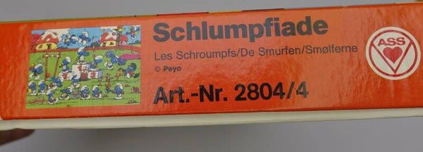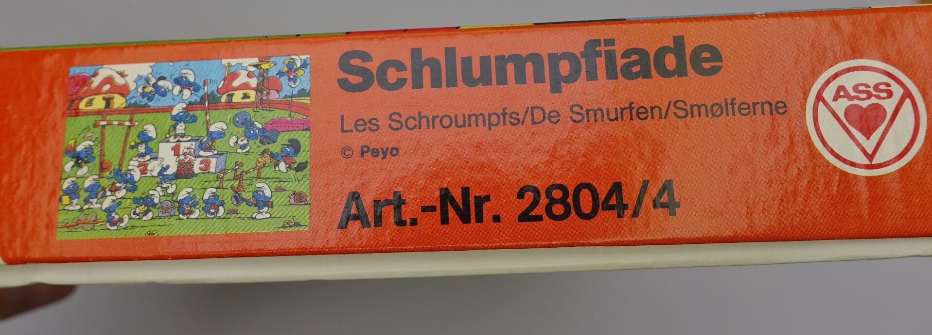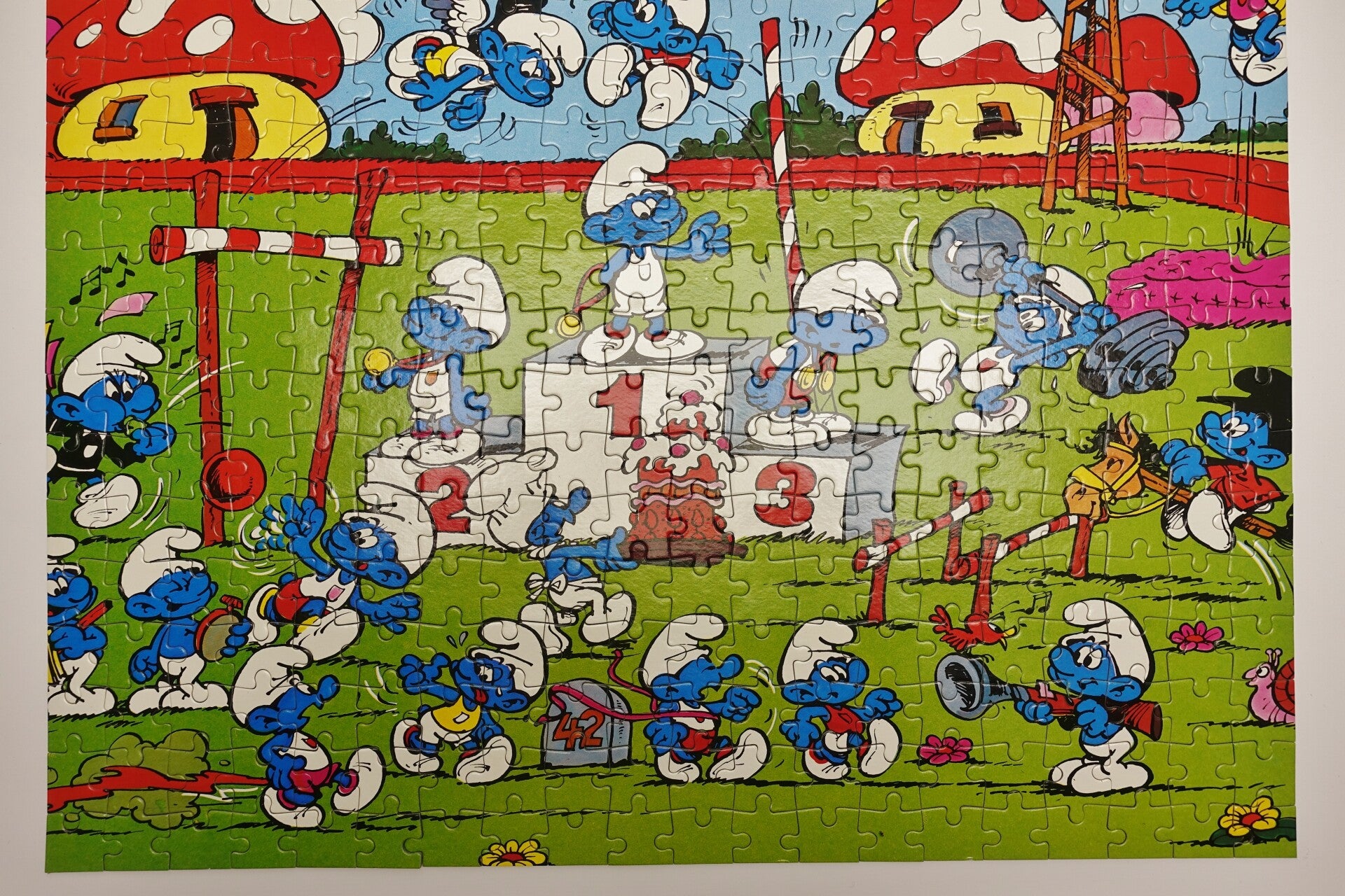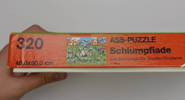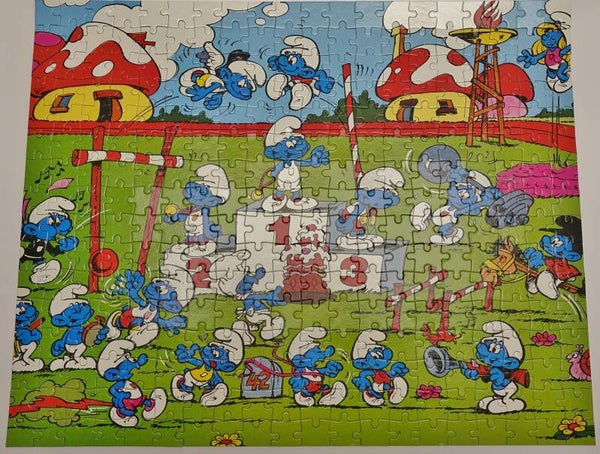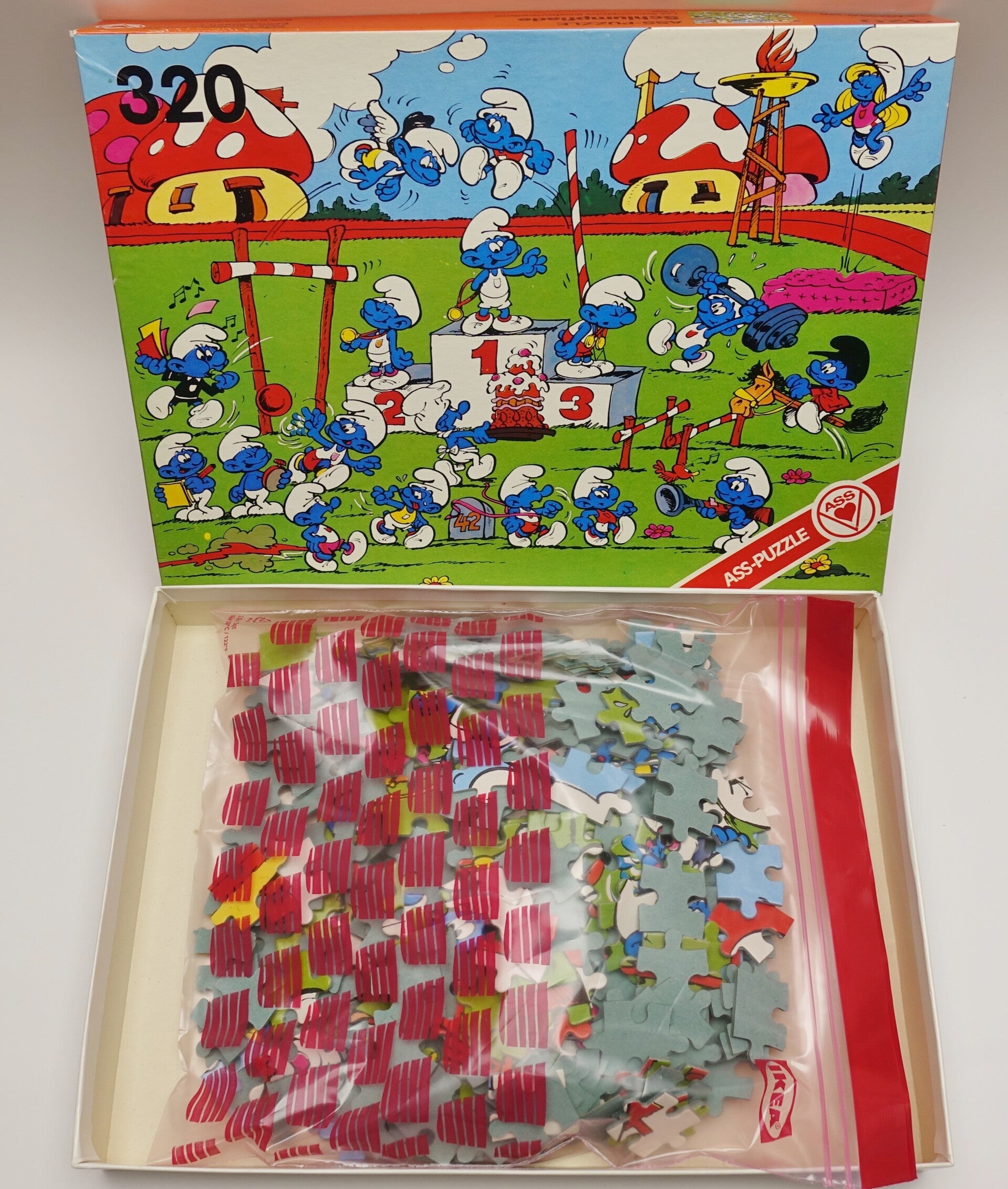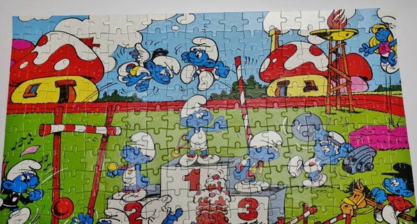 Dieses lustige Schlümpfe Puzzle mit 320 Teile darf weiterziehen. Das Puzzle ist komplett und zeigt die Schlümpfe bei der Olympiade (Schlumpfiade)
