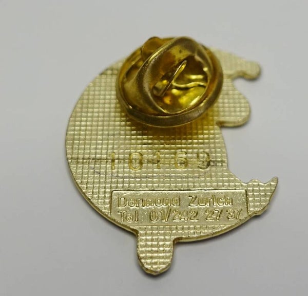 Dieser herzige Pin mit einem Figürchen auf einem Mond, darf weiterziehen. Der Pin hat die Inschrift "Dermond Zürich, Tel. 01/2422737" und die Nummer 10169. Somit ein originaler Pin.