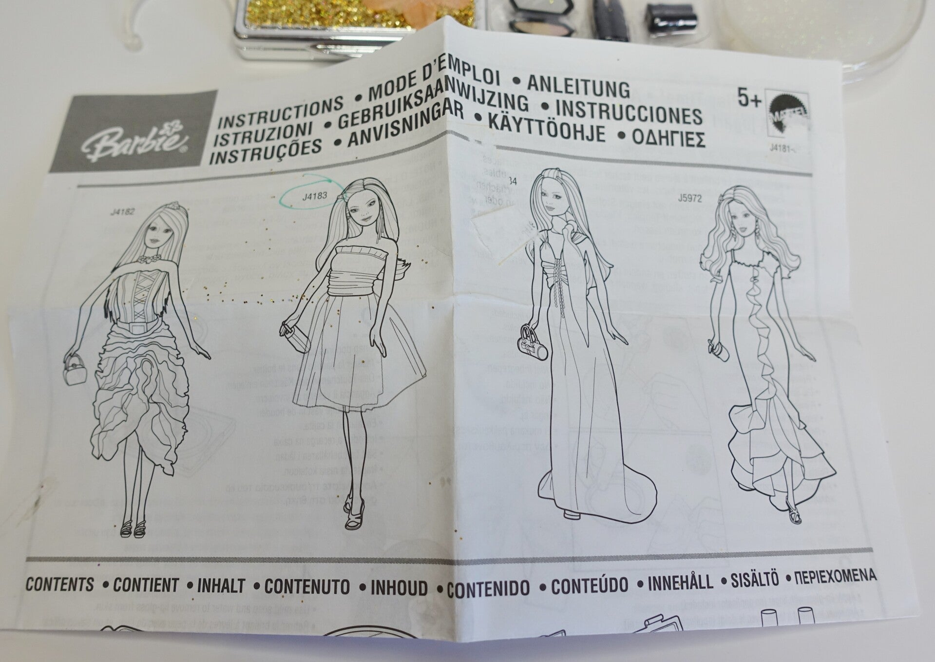Dieses Barbie Accessoires Set von 2005 darf weiterziehen. Es beinhaltet verschiedene Accessoires für Barbie sowie eine Anleitung. Die Glitzerschminke sollte an Barbie verwendet werden und nicht selbst, da das Produkt auch schon 21 Jahre alt ist.
