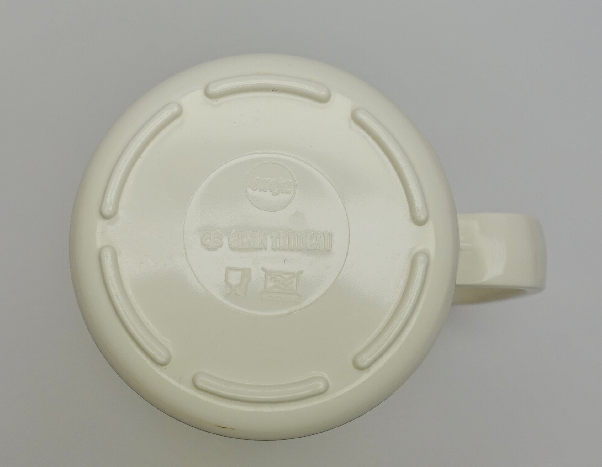 Zustand gesamt: Der Becher ist in einem guten Zustand mit Gebrauchsspuren. Im Innern vom Becher hat es dunklere Kratzer und ist etwas vergilbt. Somit nicht als Trinkbecher sondern mehr als Dekobecher geeignet. Firma: emja Genin Trudeau. Material ist Plastik.
