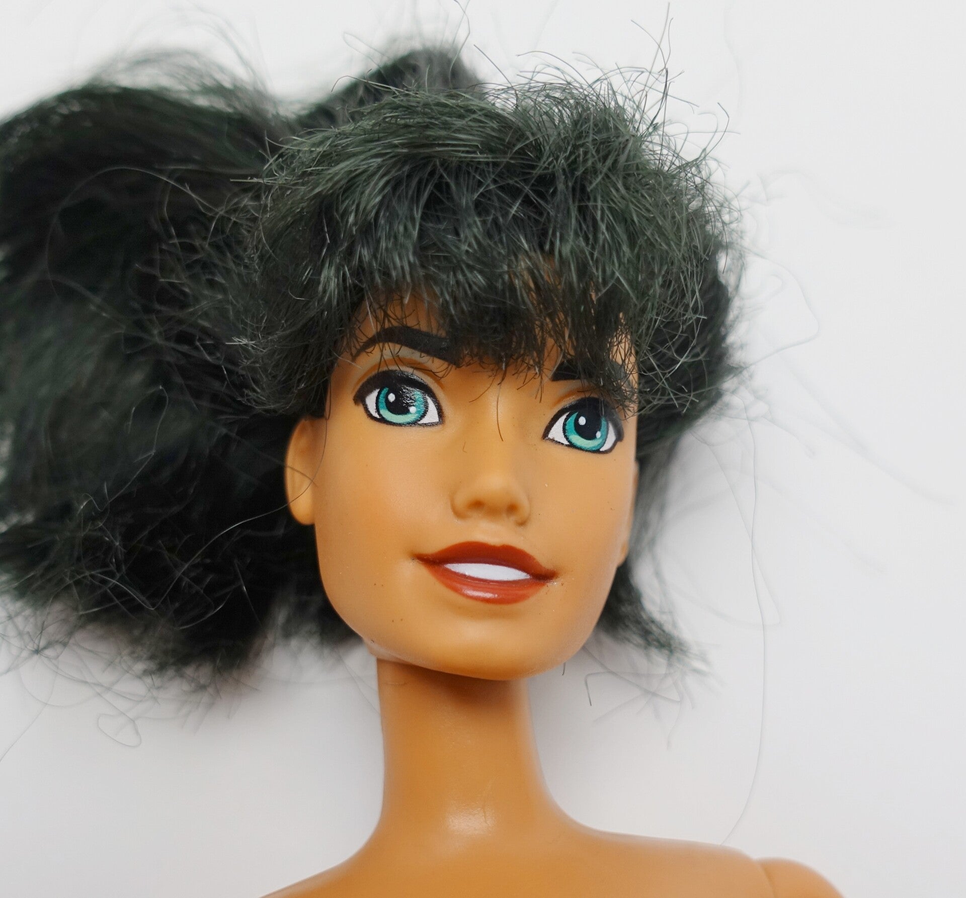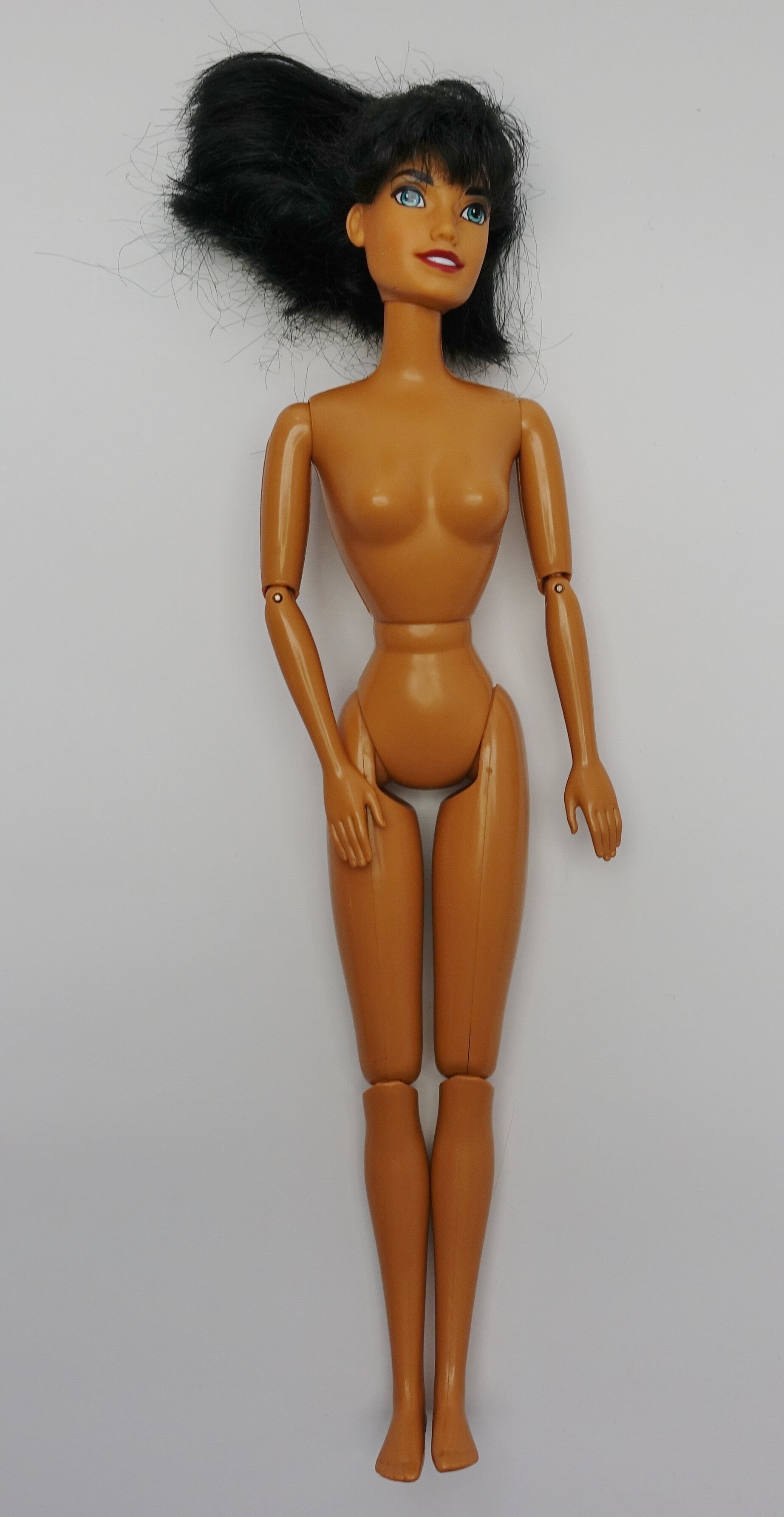 Zustand gesamt: Esmeralda an sich ist in einem guten Zustand. Jedoch wurden ihre Haare leider geschnitten. Sie sind aber noch lang genug um einen kleinen Pony zu stylen oder um ihre Haare offen zu tragen als Kurzhaarschnitt.