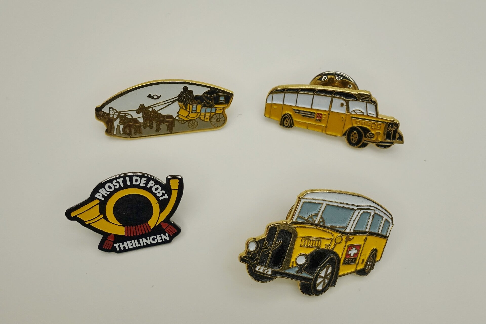Dieser 4lustigen Postauto Pins dürfen weiterziehen. Verschiedene Postauto Motive sind zu sehen.