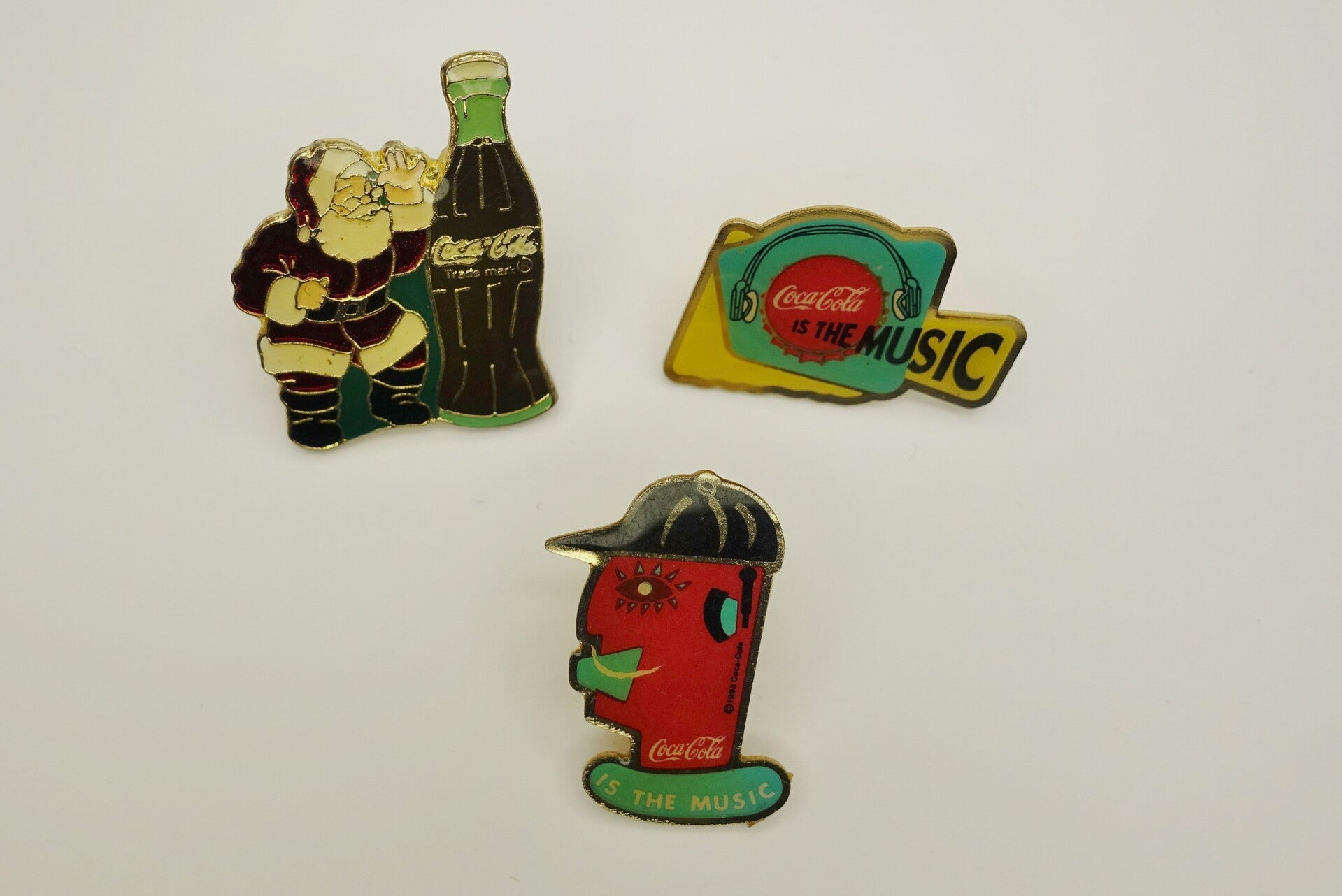 Dieser 3 lustigen Coca Cola Pins dürfen weiterziehen. Verschiedene Coca Cola Motive sind zu sehen mit Sprüchen wie Coca Cola is the Music.