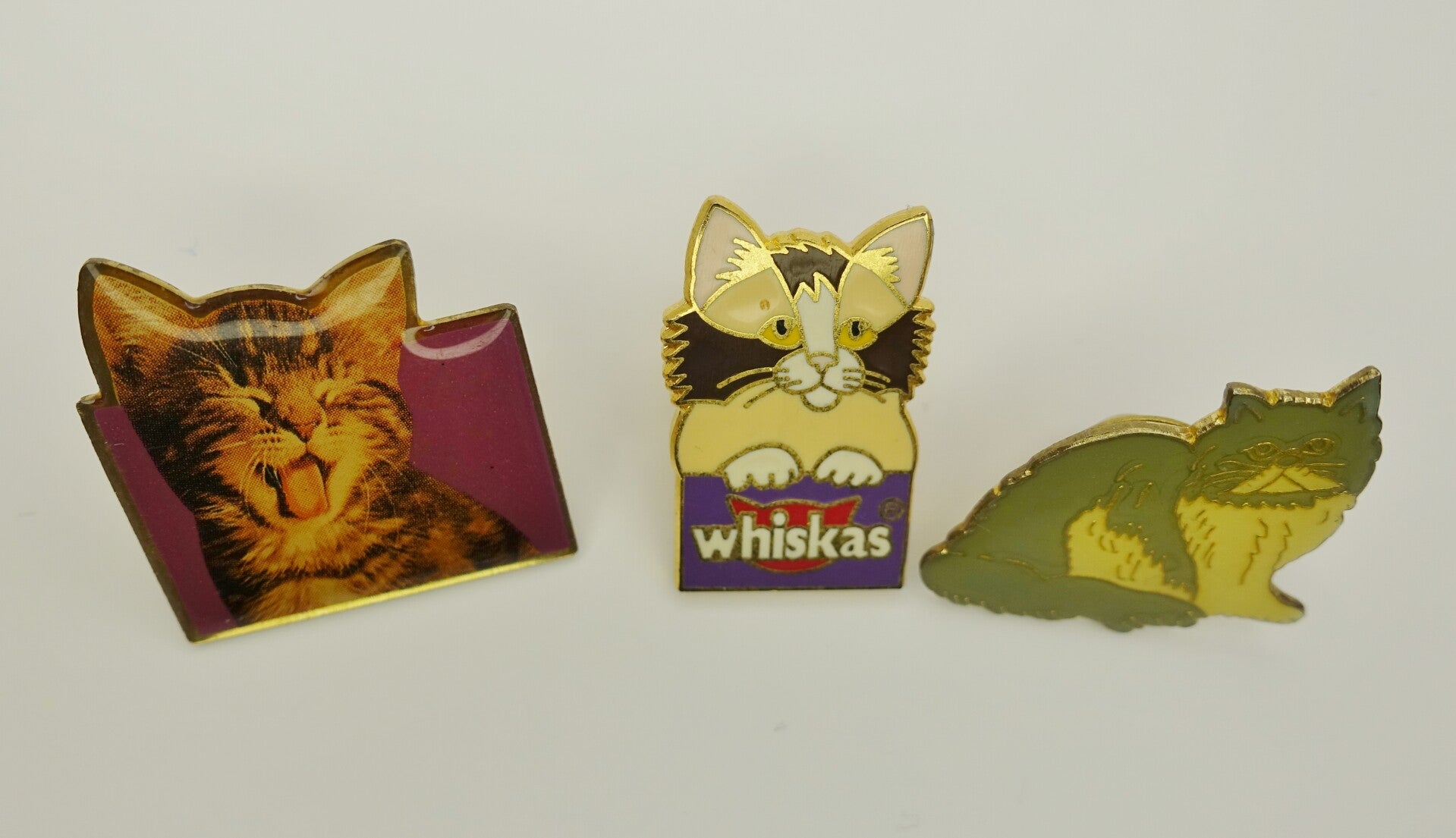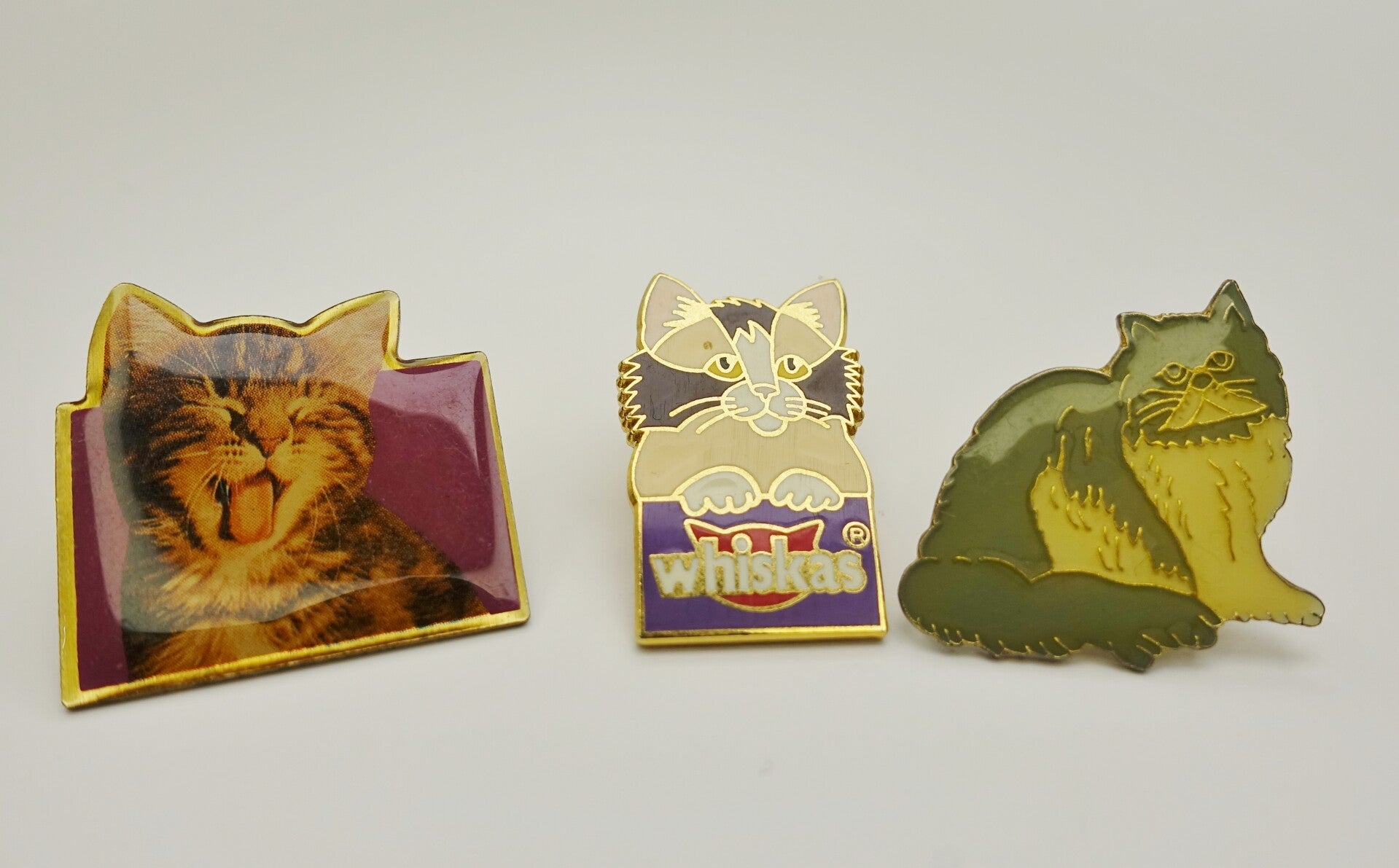 Dieser 3 lustigen katzenpins dürfen weiterziehen. 2 davon sind mit Whiskas angeschrieben.